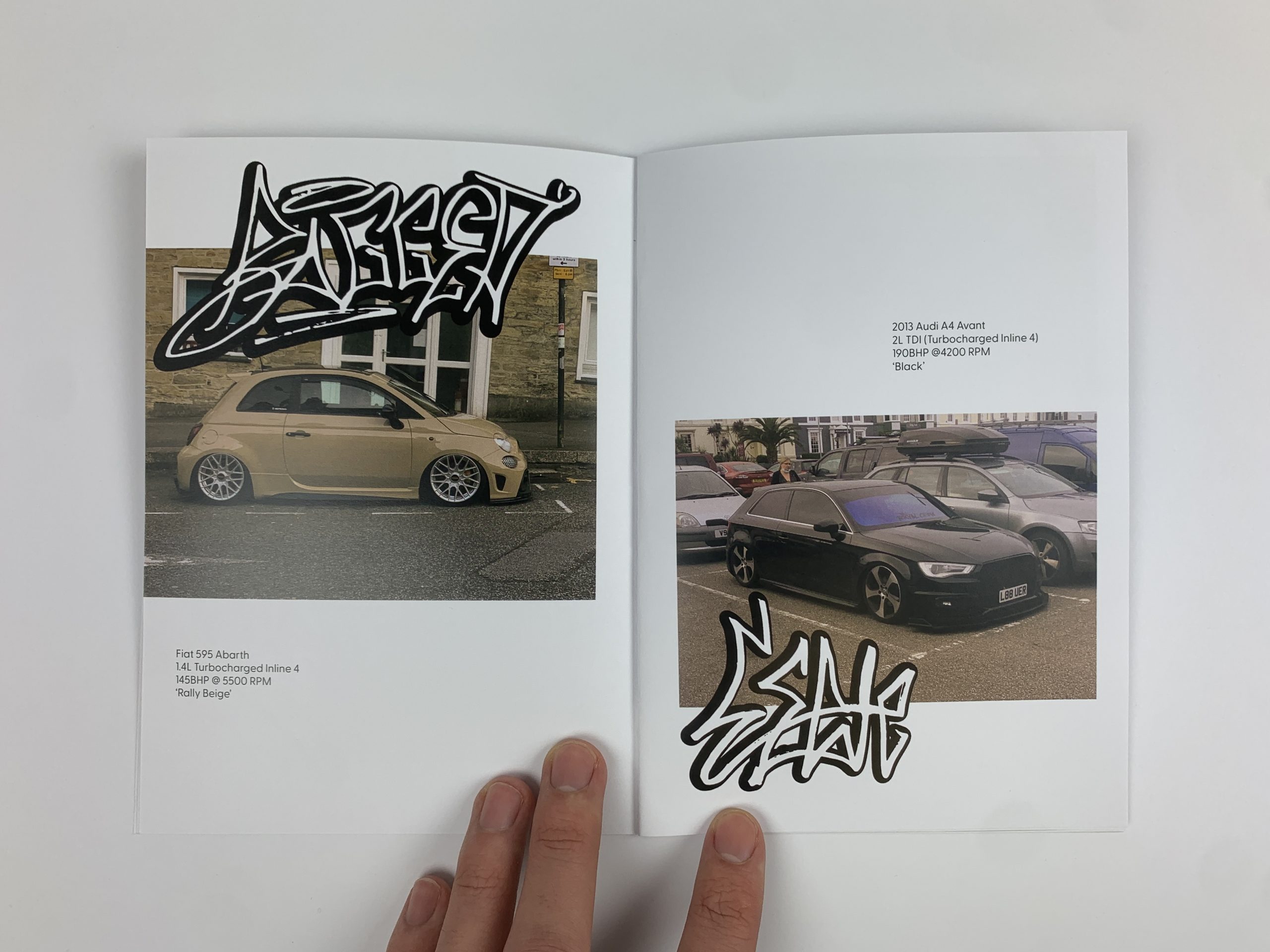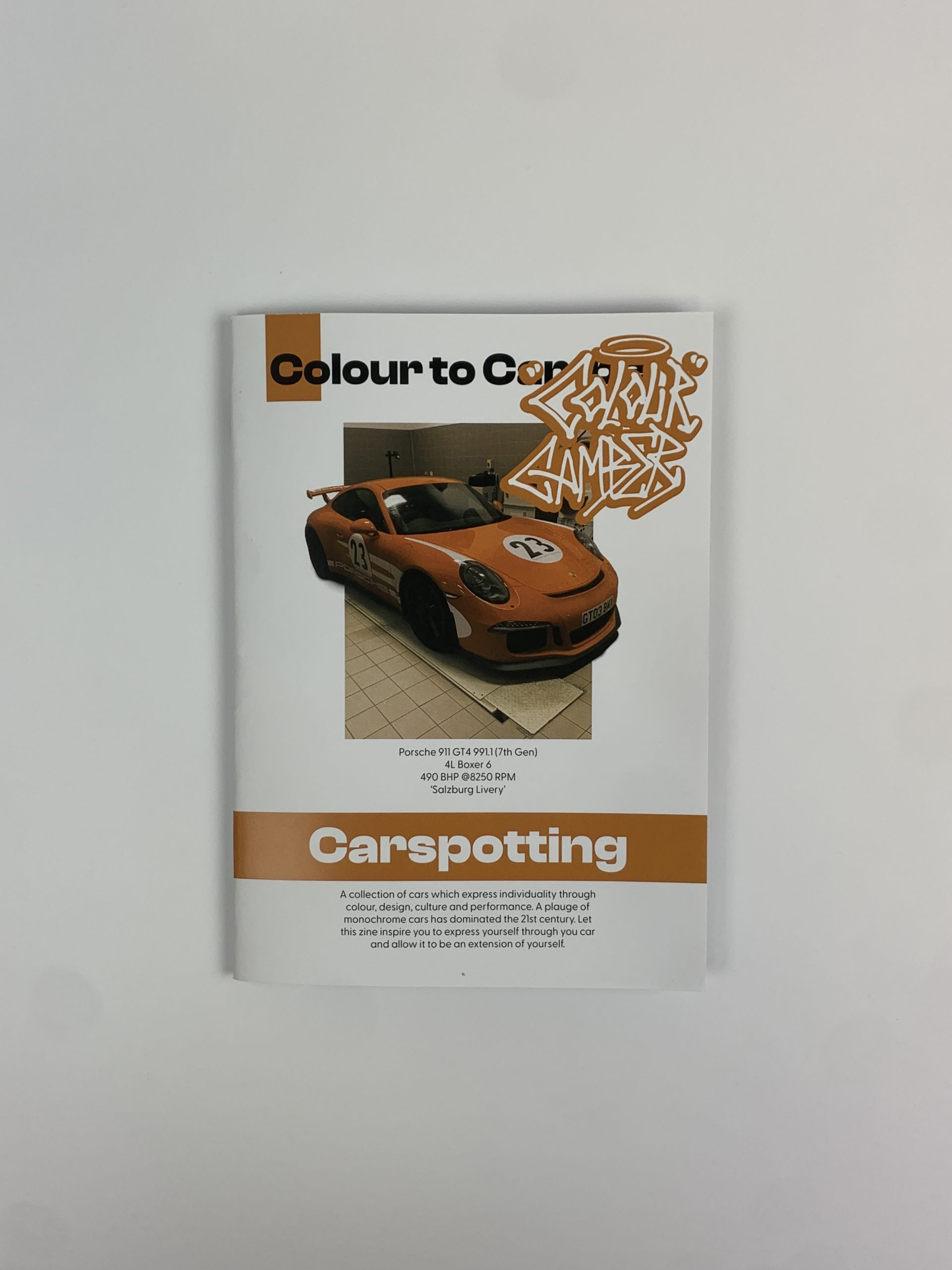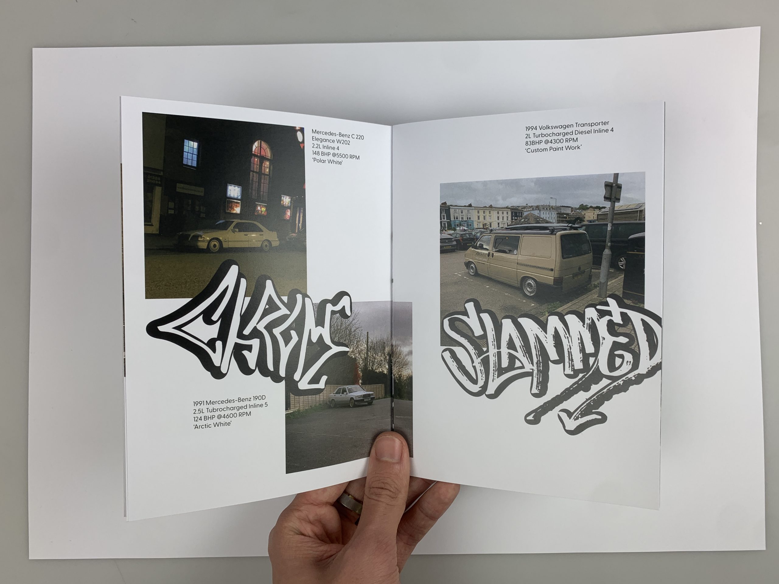 Colour to Camber is a personal exhibition project promoting unique car designs. The automotive industry has become extremely monotonous, with most cars painted grey, black, or white. This project emphasizes expressing individuality through car colour, modification, and aesthetics. Car culture is considered a subgenre of street culture, which I extensively explored in my designs. The photos for the zine, along with all the materials, come from an archive of expressive cars that I’ve photographed over several years.