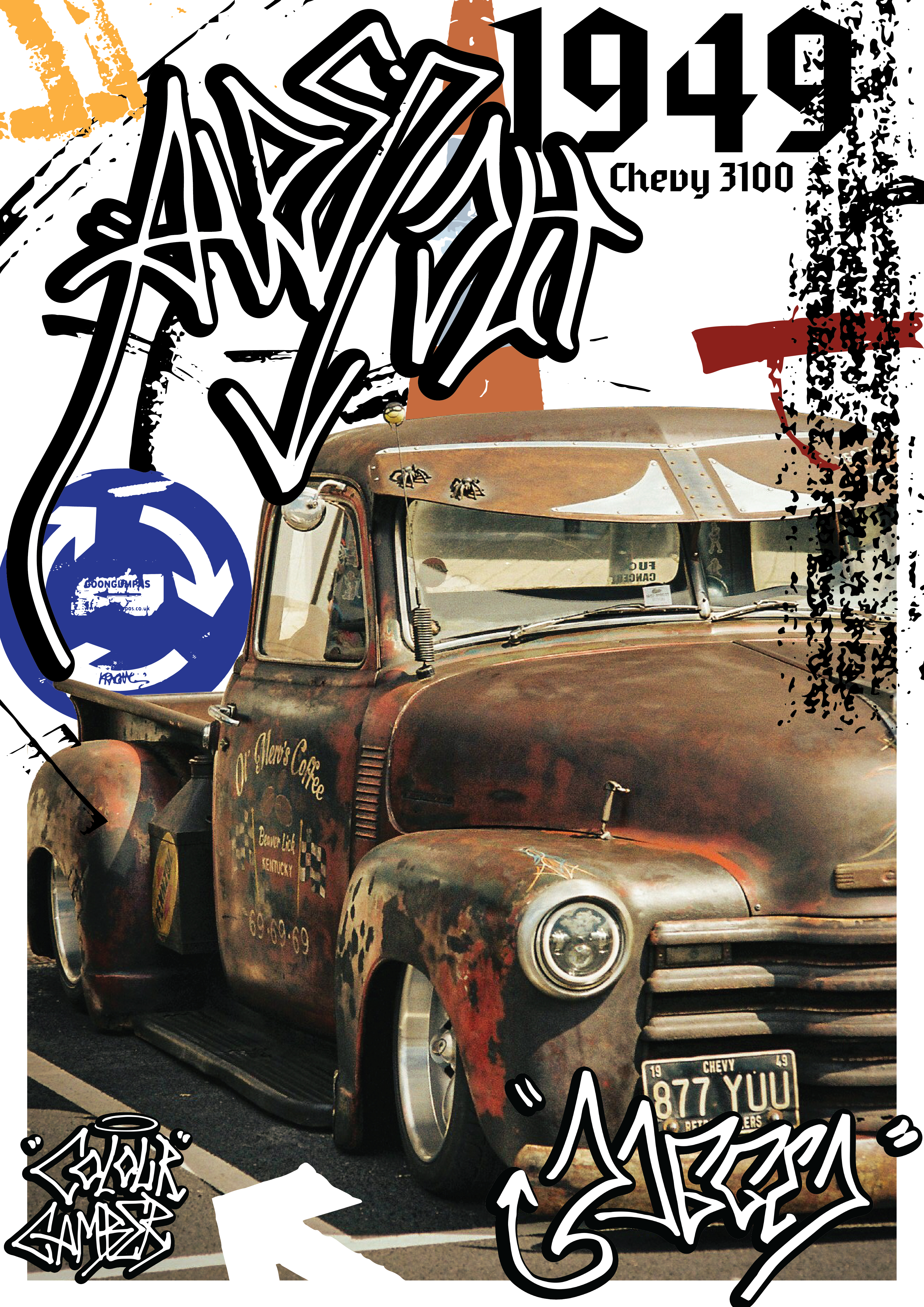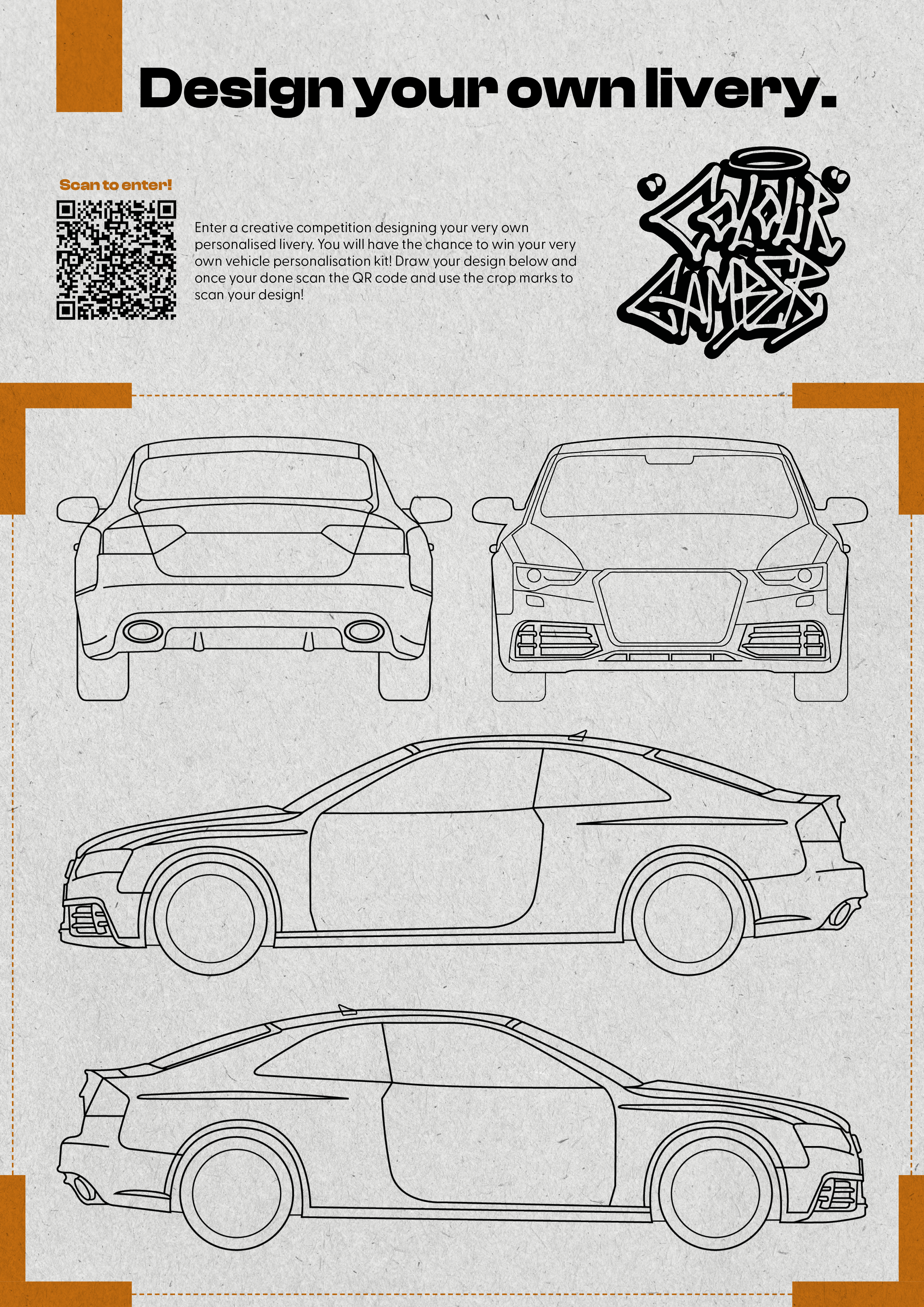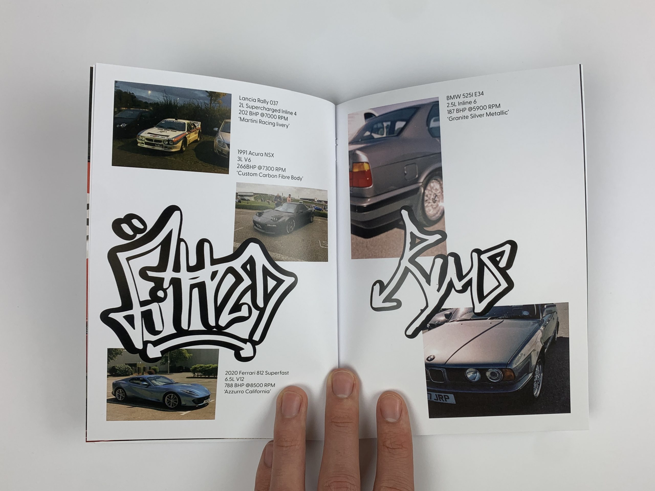 Colour to Camber is a personal exhibition project promoting unique car designs. The automotive industry has become extremely monotonous, with most cars painted grey, black, or white. This project emphasizes expressing individuality through car colour, modification, and aesthetics. Car culture is considered a subgenre of street culture, which I extensively explored in my designs. The photos for the zine, along with all the materials, come from an archive of expressive cars that I’ve photographed over several years.